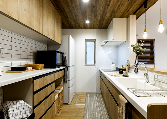 背面収納やカウンター収納を造作し、使うものをすっきりと収められる設計に。見せる収納と隠す収納をバランス良く配置しています。